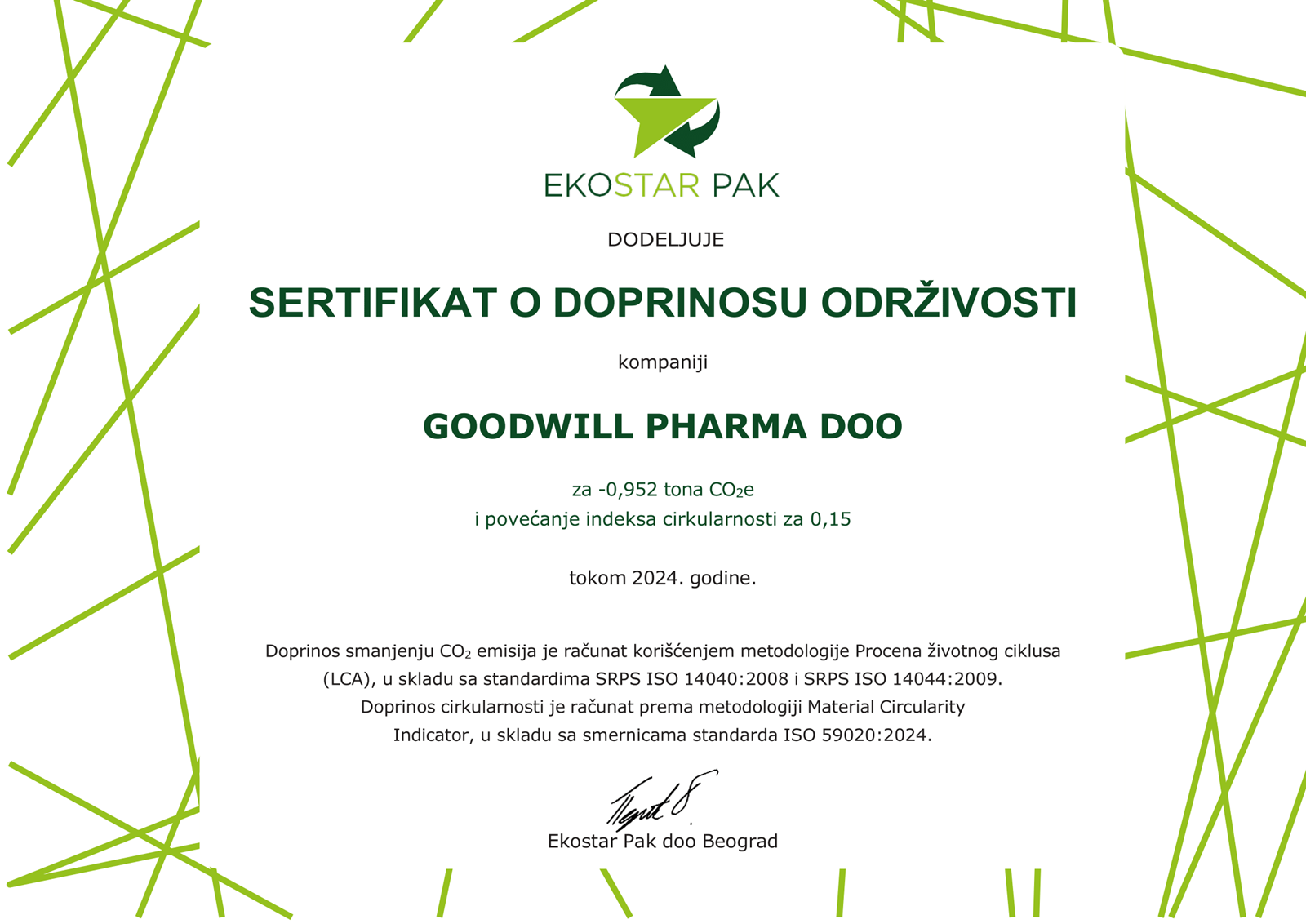 Ponosni smo što smo prepoznati kao kompanija koja doprinosi održivosti i smanjenju CO2. Naša posvećenost održivom poslovanju je naša svakodnevna praksa. Nastavljamo i dalje odgovorno da gradimo zelenije sutra.